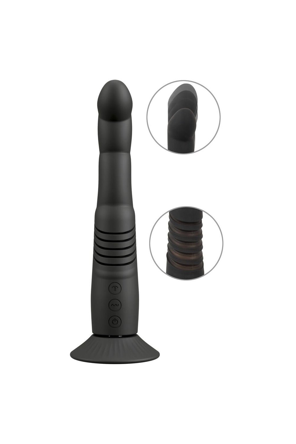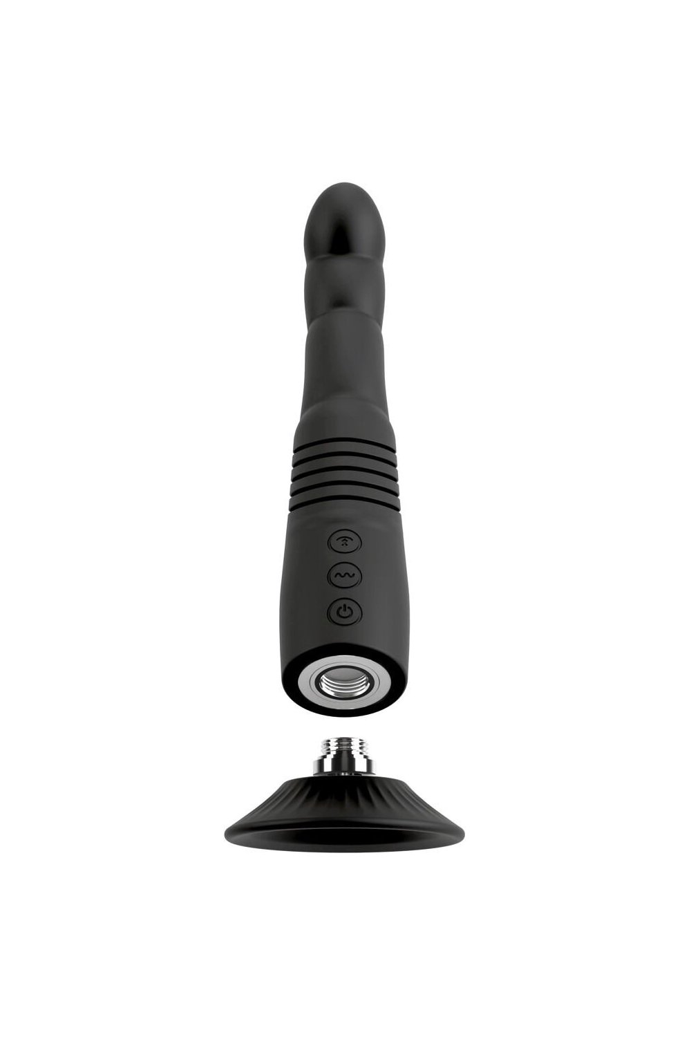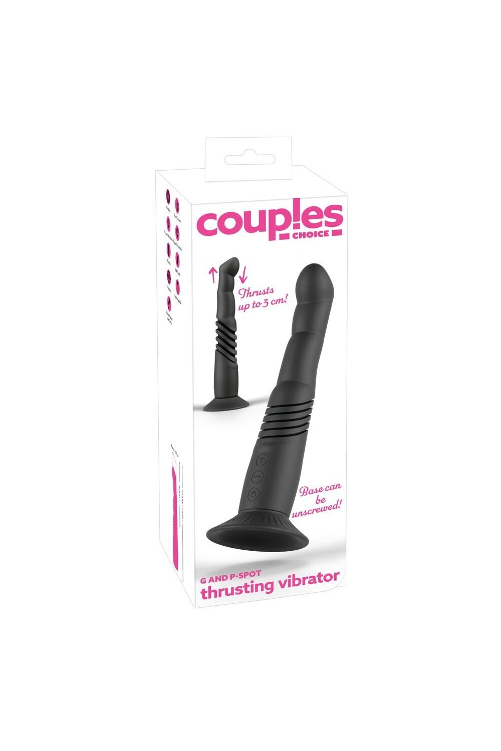 The thrusting vibrator can also be quickly and easily inserted into a strap-on or harness, thanks to its suction cup. The suction cup can also be unscrewed.