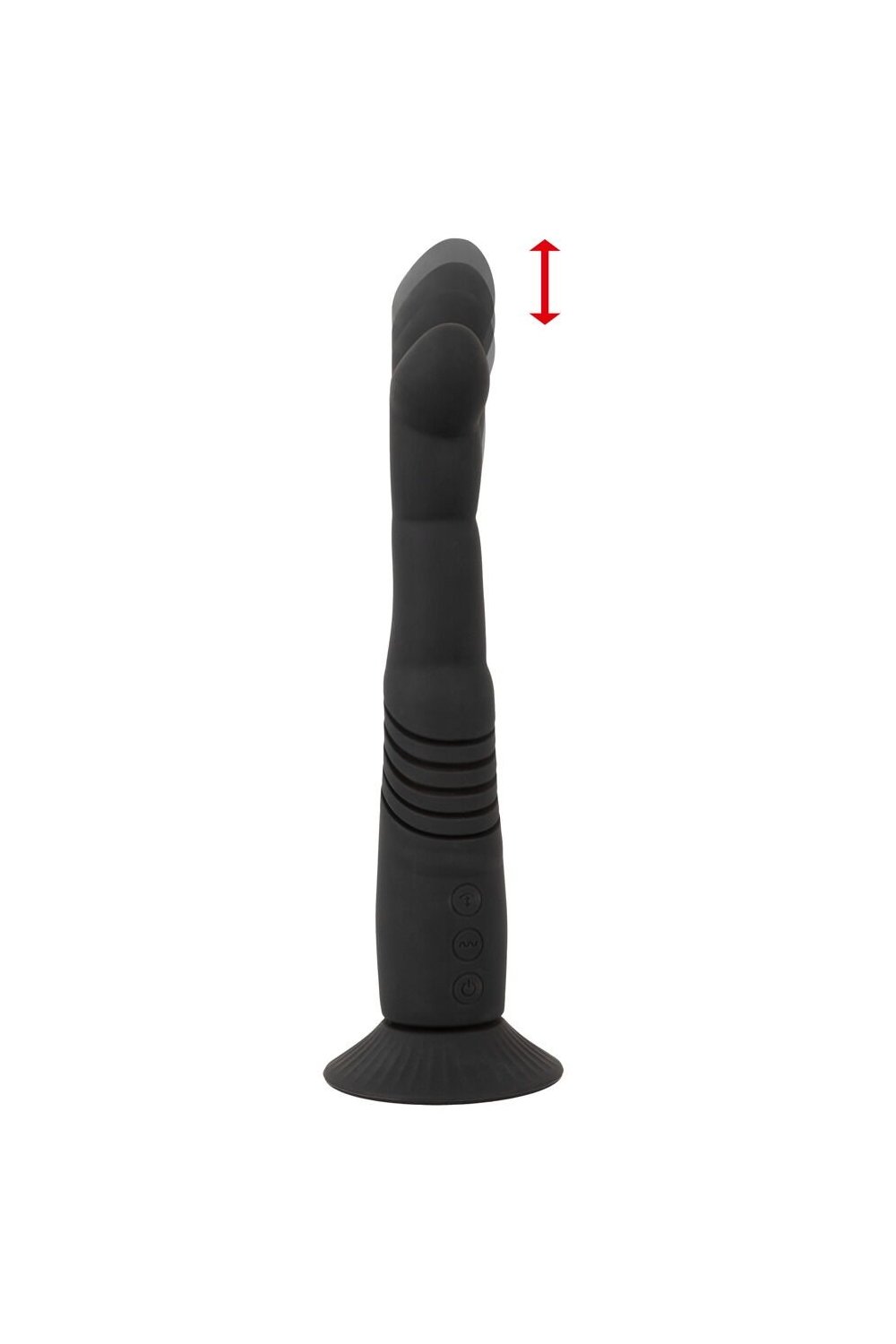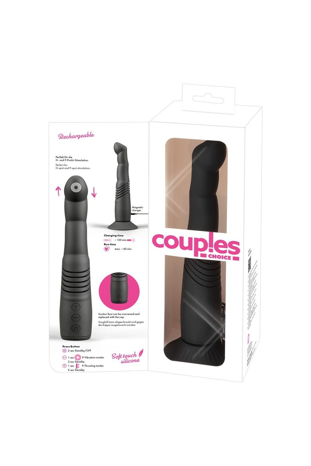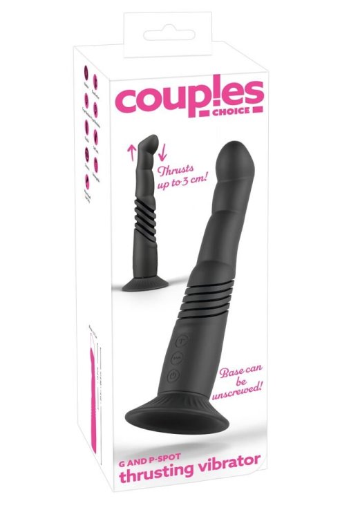 The G and P-Spot Thrusting Vibrator from Coup!es Choice has a removable suction cup. The flexible thrusting vibrator is modeled on a curved but flexible finger that can easily reach the G-spot or the P-spot (prostate).
