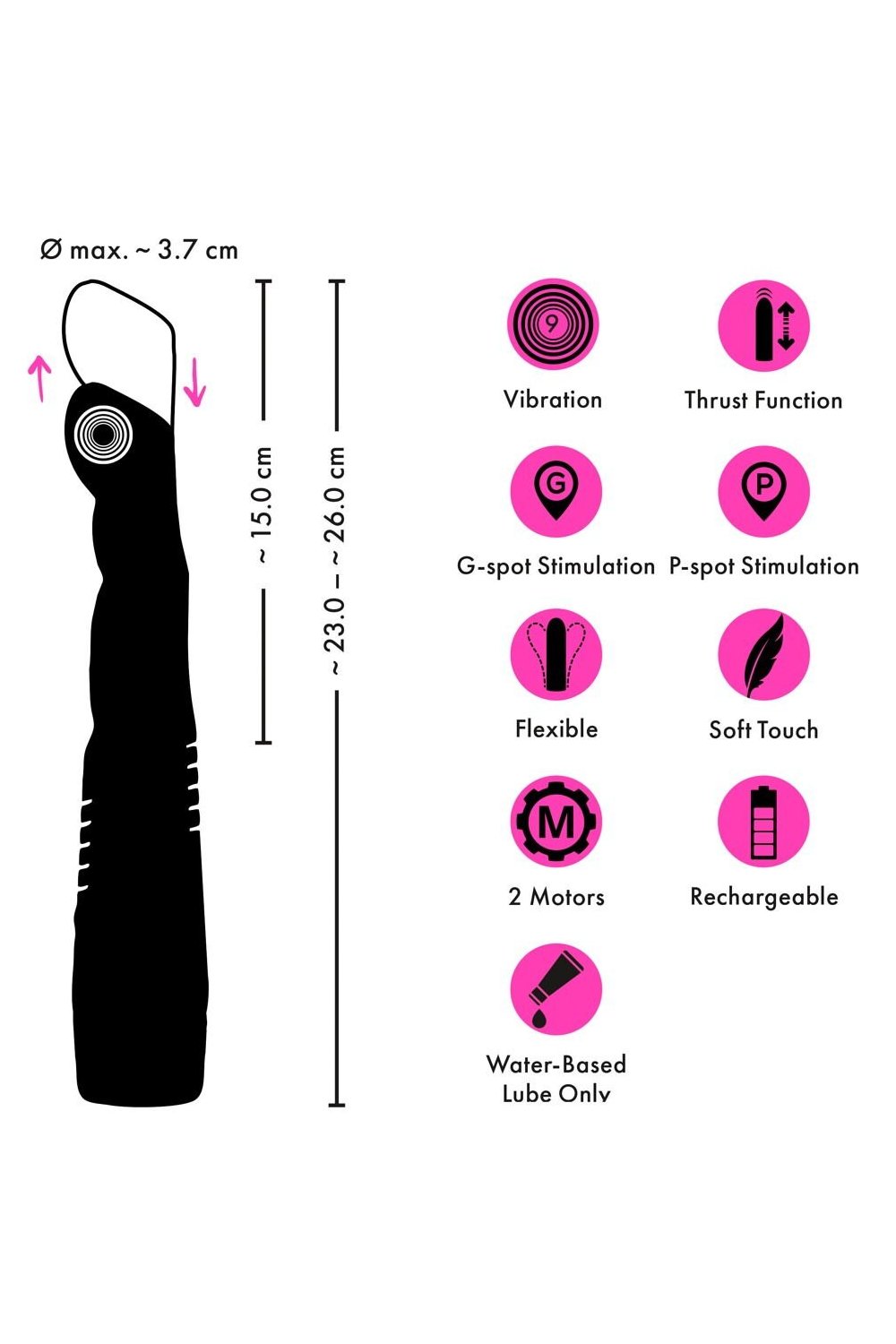 The 2 powerful but quiet motors provide the easy-to-use thrusting vibrator with reliable power. The 9 vibration modes and 9 thrusting speeds (stroke length more than 3 cm) can be easily controlled directly on the toy at the push of a button – together or separately.