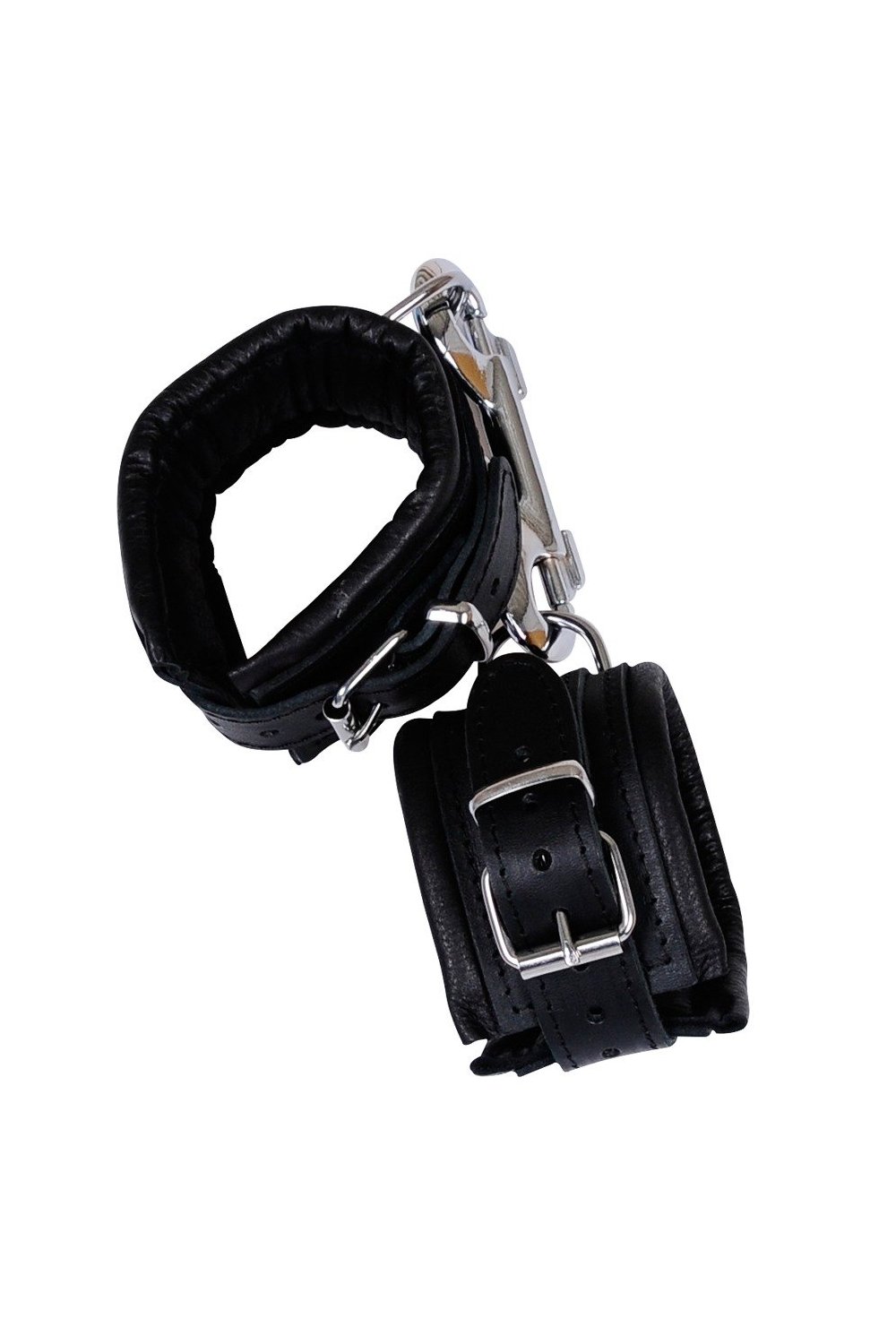 Fully made from black leather. Adjustable buckle closures. With double snap hook.