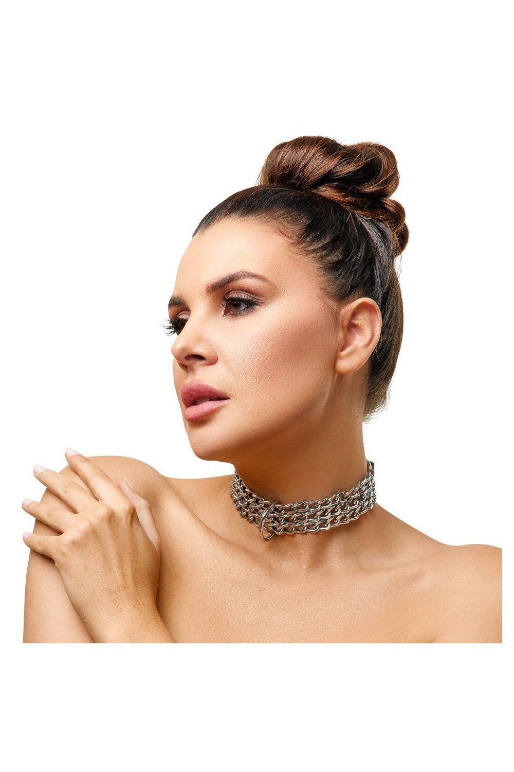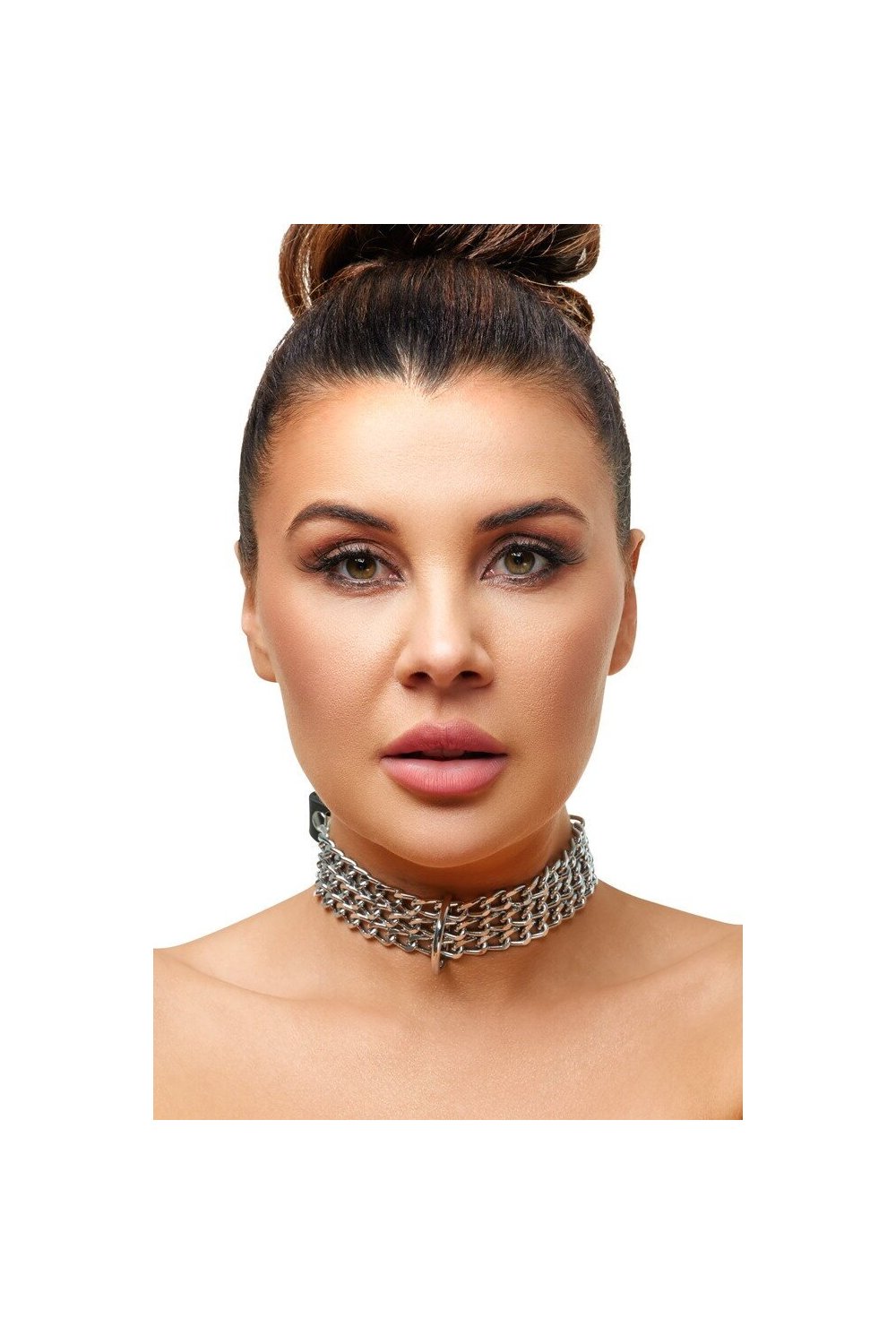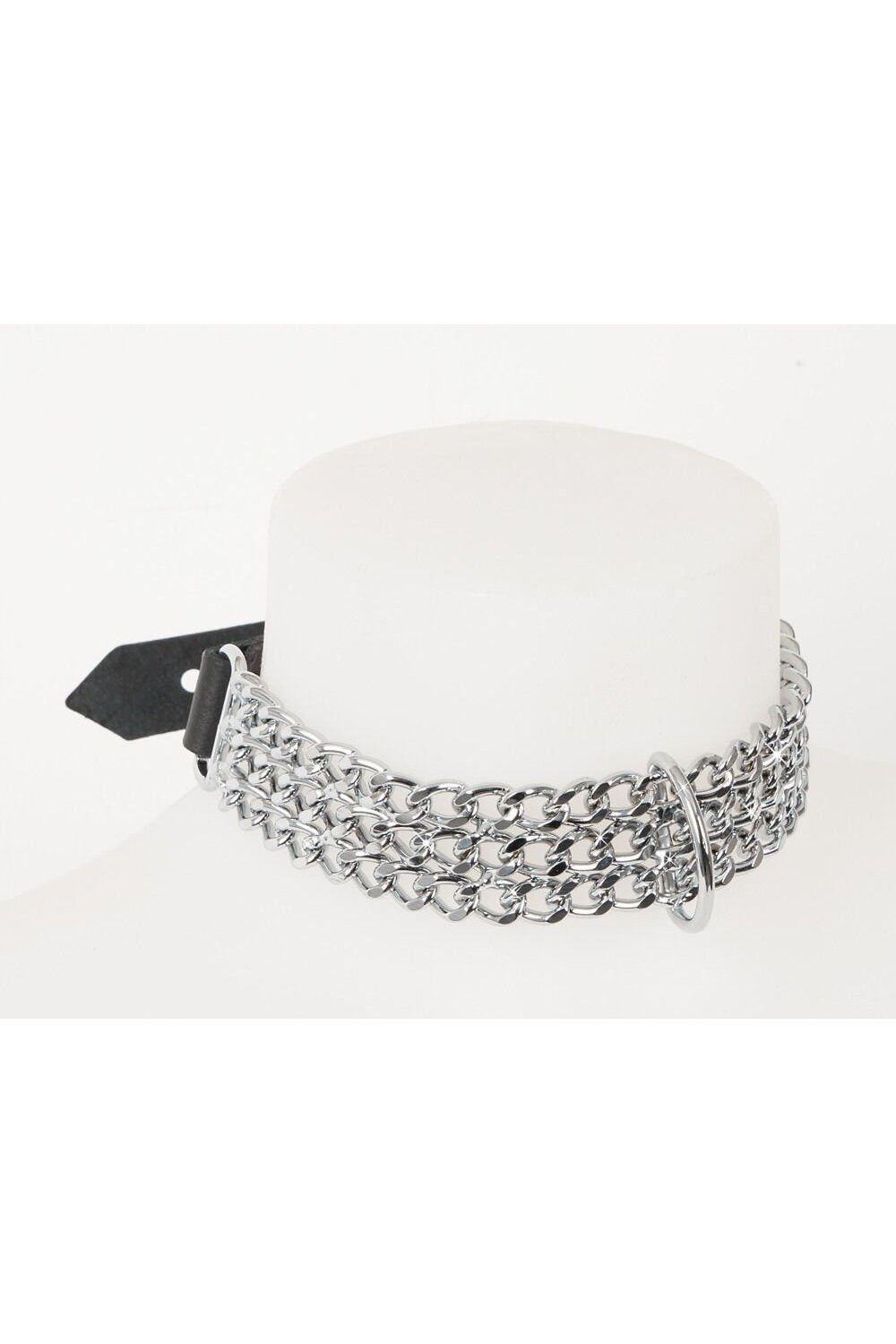 Crni, kožni okovratnik sa tri metalna lančića u srebrnoj boji i središnjim prstenom na koji se može pričvrstiti povodac... Za slobodne i odvažne igrice dominacije i pokornosti! Podesiv sa kopčom kao na kaišu! Veoma izdržljiv i snažan!