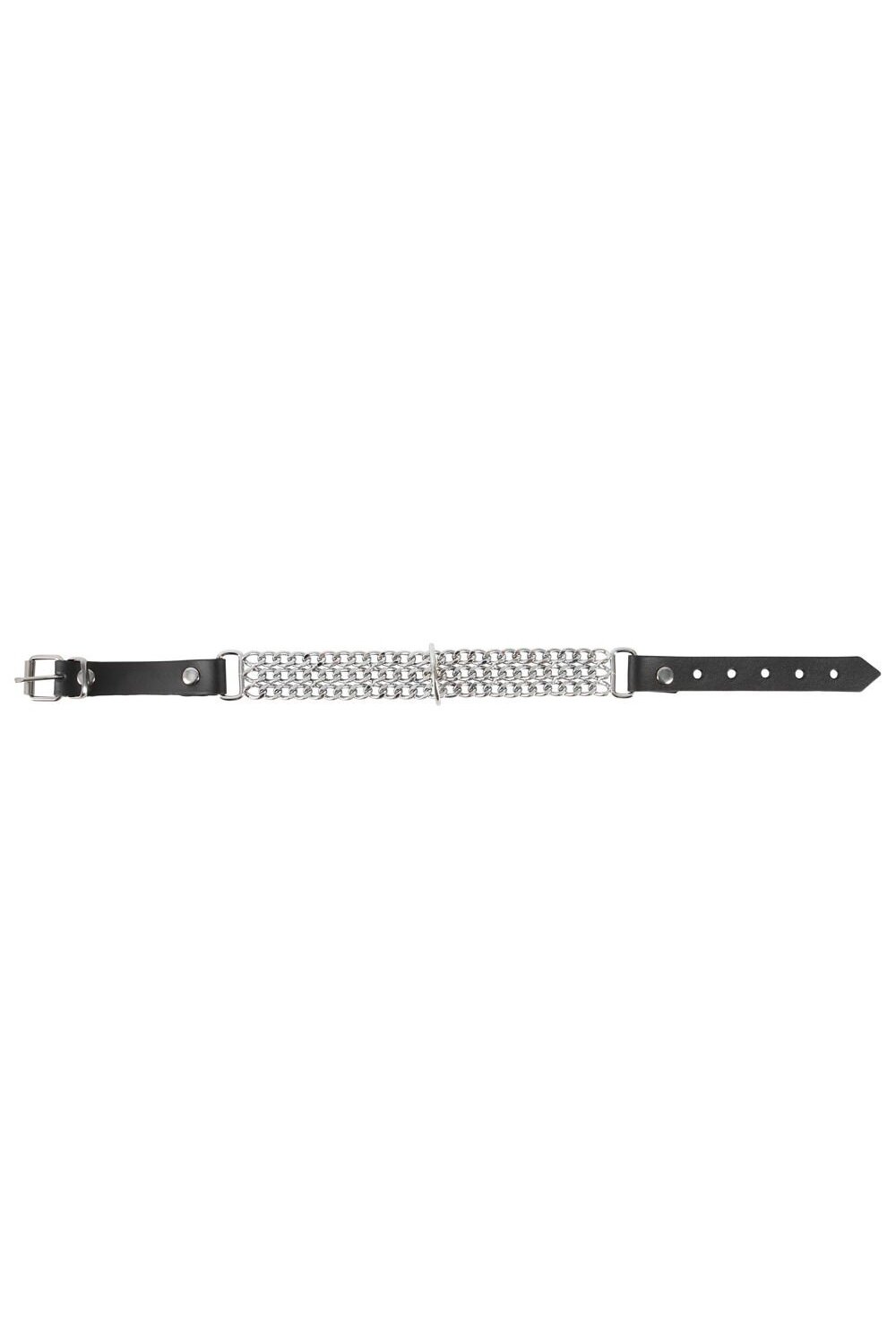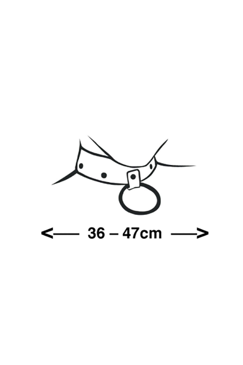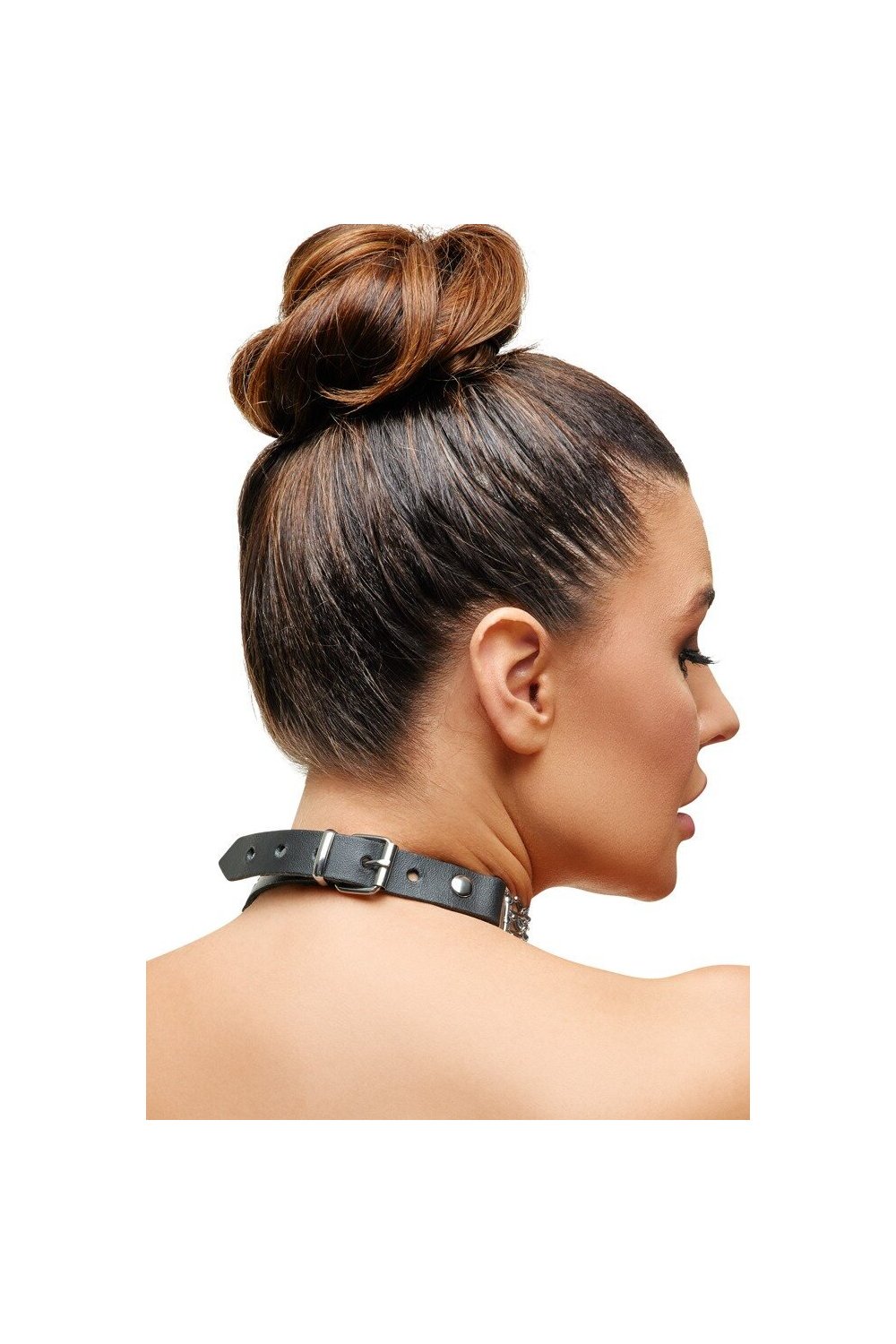 Crni, kožni okovratnik sa tri metalna lančića u srebrnoj boji i središnjim prstenom na koji se može pričvrstiti povodac... Za slobodne i odvažne igrice dominacije i pokornosti! Podesiv sa kopčom kao na kaišu! Veoma izdržljiv i snažan!