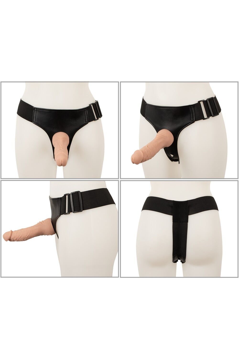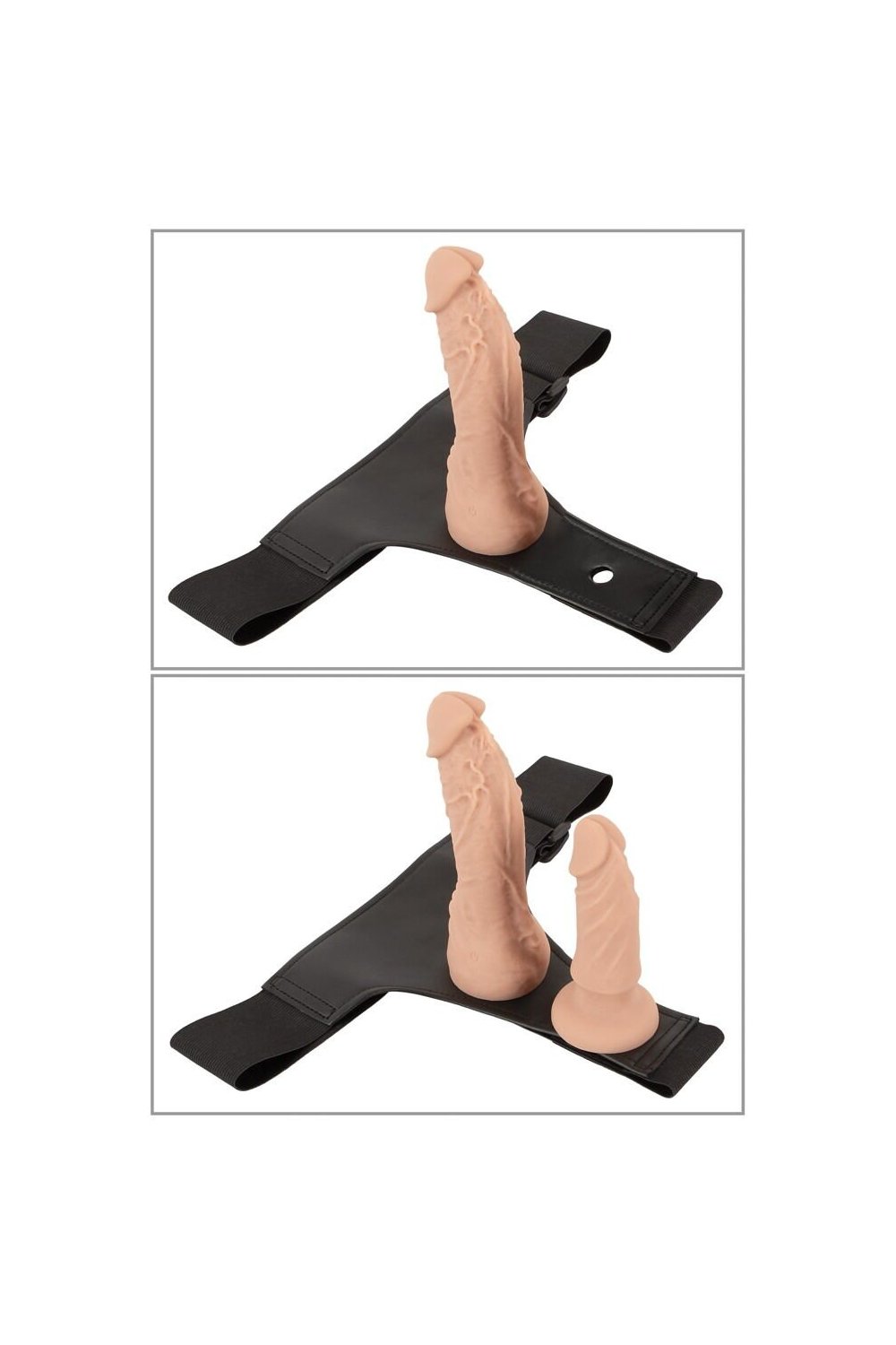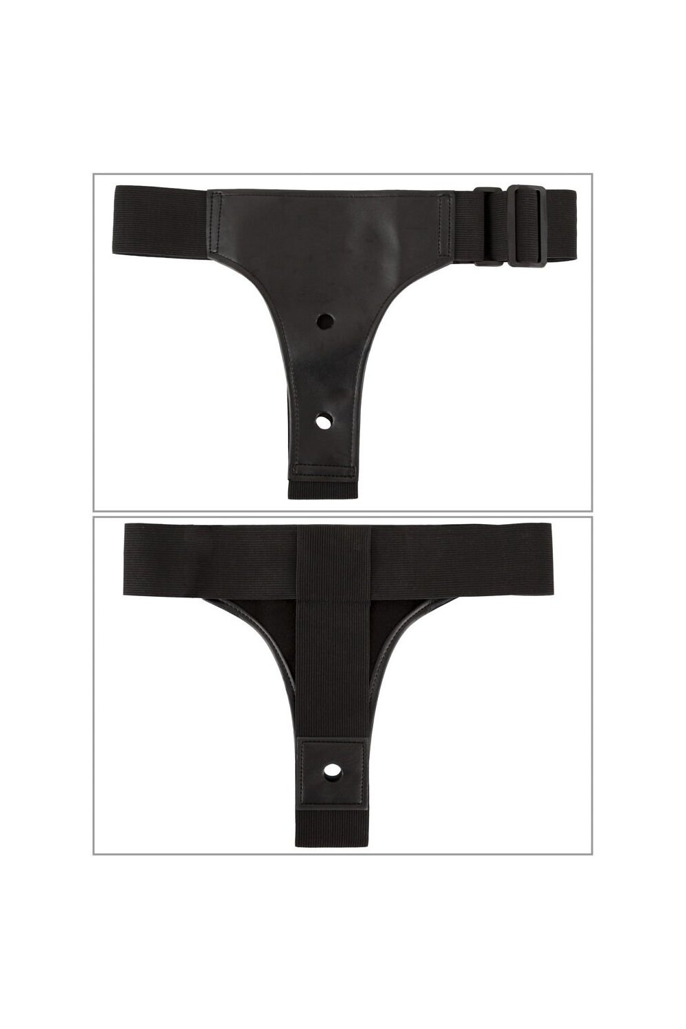 Strap-on pojas napravljen od stilske veštačke kože sa širokim rastegljivim kaiševima je podesiv po veličini tako da sve čvrsto i udobno pristaje. Vibrator i dildi se jednostavno zavrću u 3 otvora pojasa sa njihovim kontra pločicama po želji.
